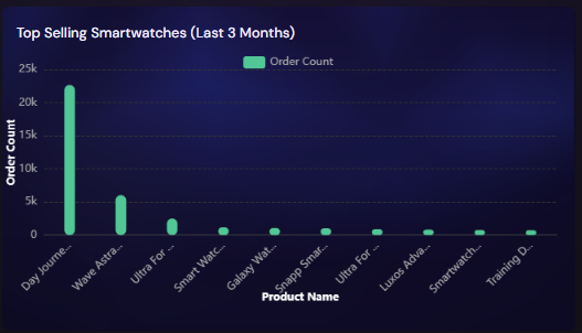 In comparison, the remaining smartwatch models show significantly lower order volumes. This indicates that demand may be highly concentrated around a few standout products, while other models cater to smaller, niche audiences or rely on targeted marketing strategies.