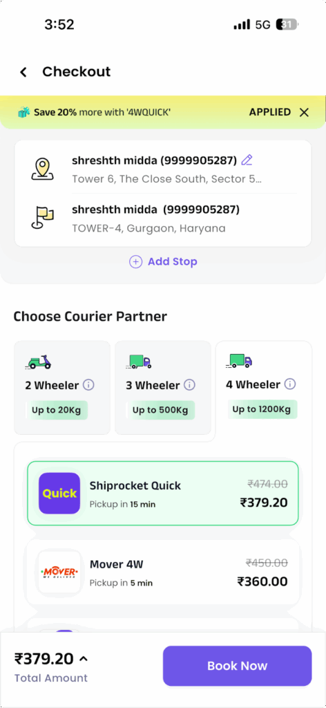 Access 2-wheeler, 3-wheeler, and 4-wheeler courier partners directly in your Shiprocket Quick App for faster deliveries within the city.
