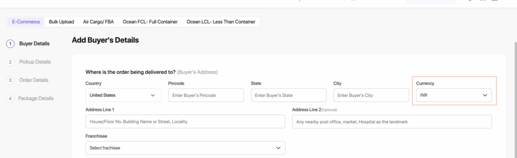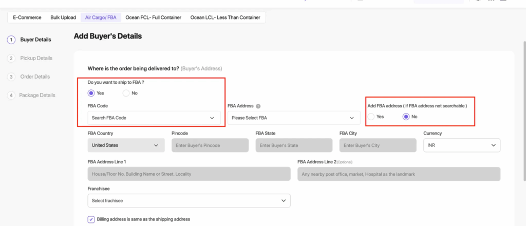 We’ve streamlined the E-commerce B2C order creation process by removing the FBA (Fulfilled by Amazon) option. FBA Order Flow is now exclusively available for Air Cargo and Ocean LCL shipments, ensuring a more focused and efficient experience for sellers managing larger shipments.