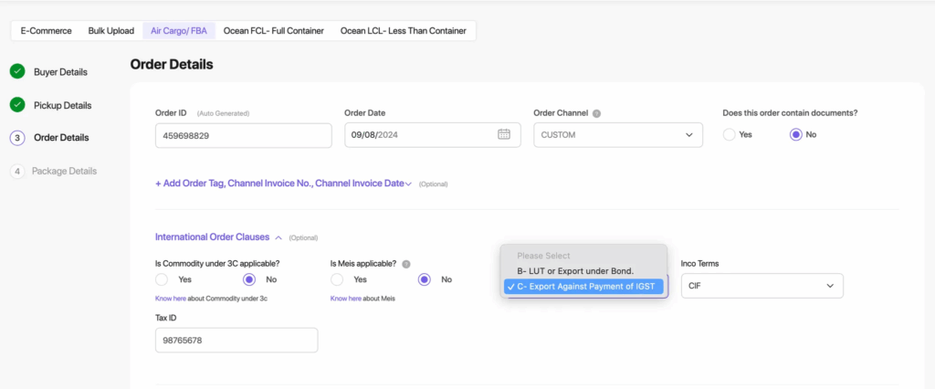 We are excited to announce a new feature update in the International Order creation workflow—separate tabs for B2C, B2B Air, and B2B Ocean shipments. This enhancement allows sellers to effortlessly navigate and manage their logistics operations by categorizing shipments according to type.