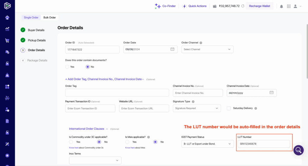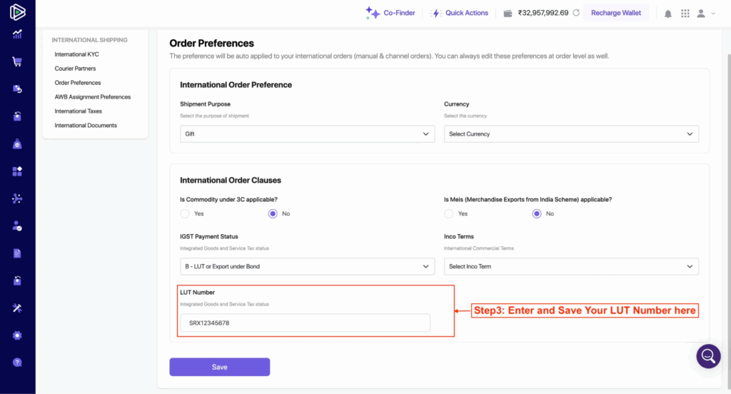 Managing your LUT (Letter of Undertaking) Number just got easier! You can now save your LUT Number in the Order Preference section within the settings page. Once saved, it will automatically apply to all your single and bulk orders, eliminating the need to enter it manually every time.