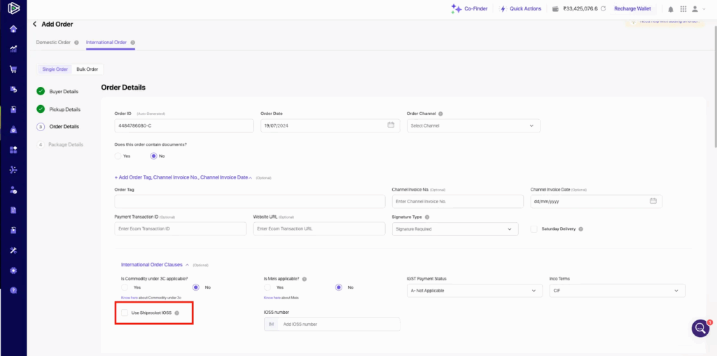 - Automatic Deselection: When creating new orders, the Shiprocket IOSS and EORI services will now be auto-deselected. Users will need to manually select these services if they wish to use them.