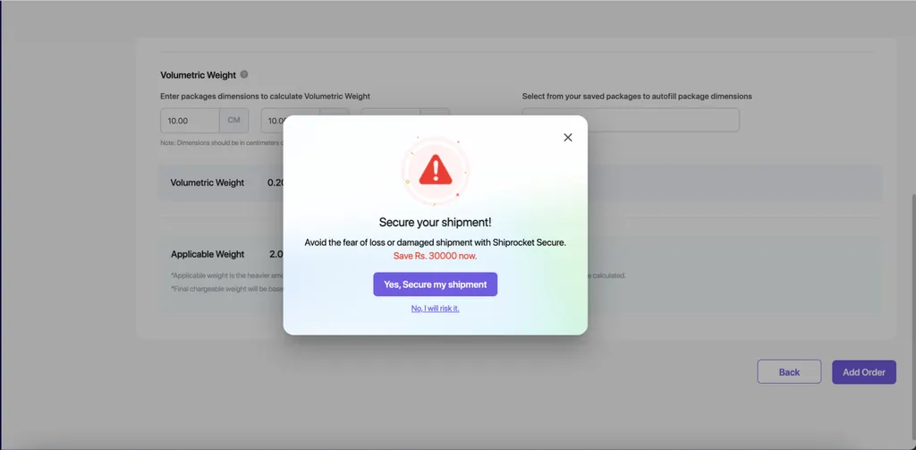 - Popup Introduction: We’ve added a popup on the package details screen, allowing sellers to opt for secure shipping directly. This feature helps sellers avoid the risk of lost shipments and ensures peace of mind.