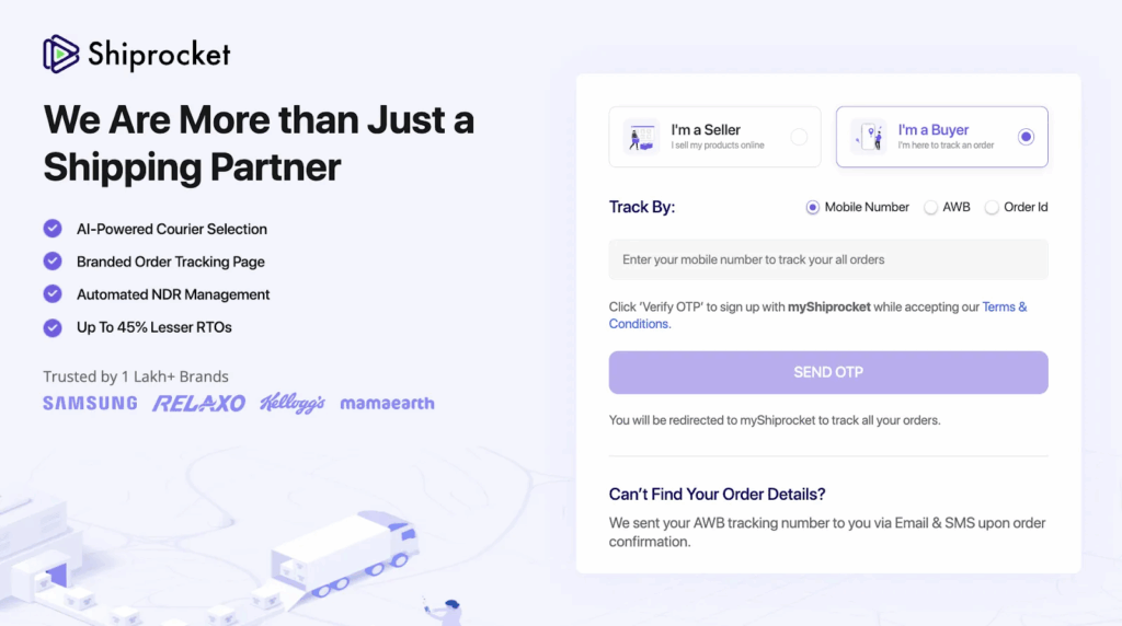 When a buyer visits the Shiprocket website, possibly through a redirection URL in SMS or email, we anticipate that they may be seeking to track their order. As a result, we’ve developed a convenient access button for them to track their order using their Mobile Number, AWB, or Order ID.