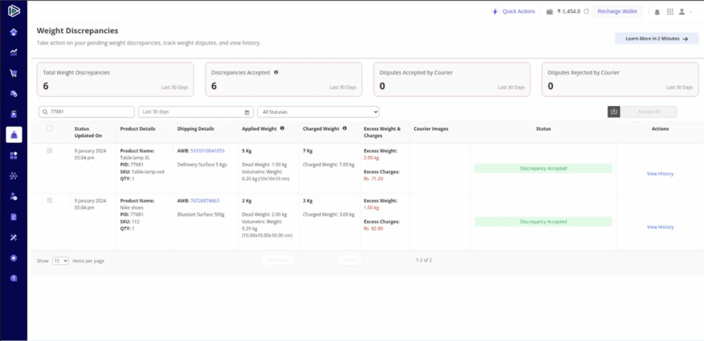 On the Weight Discrepancy page, within the search bar, sellers now have the capability to search for products or AWBs using the PID.