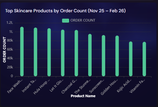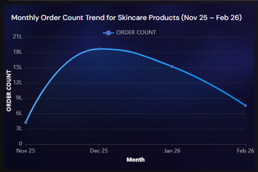 Recent order data shows a dramatic spike of 1.86 million skincare orders in December 2025, followed by a sharp drop to 755K orders in February 2026. This fluctuation highlights a critical insight: skincare demand is strong, but highly timing-sensitive.