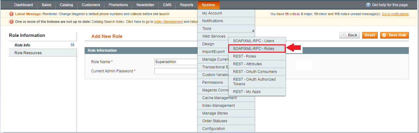 6. Go to System -> Web Services -> SOAP/XML -RPC – Roles