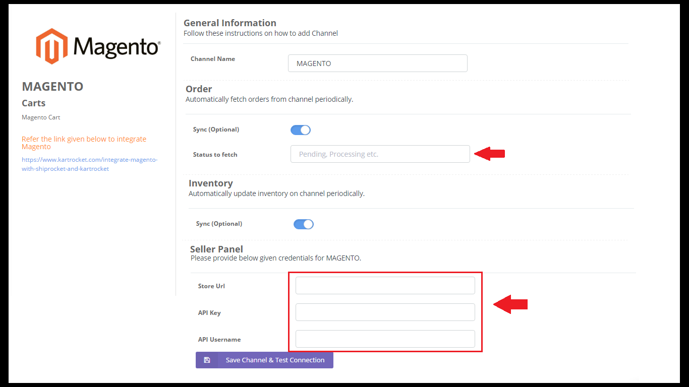 5. Switch “On” the Order and Inventory Sync. (Mention Status of orders on Magento to be fetched into the system)