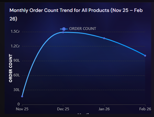 சமீபத்திய புள்ளிவிவரங்கள் நவம்பர் 2025 முதல் பிப்ரவரி 2026 வரை மாதாந்திர ஆர்டர் போக்கு குறைந்து வருவதைக் காட்டுகின்றன, பிப்ரவரியில் 10.07 மில்லியன் ஆர்டர்கள் செங்குத்தான சரிவுடன். இது பருவகால மந்தநிலை மற்றும் மொபைல் வர்த்தக செயல்திறனைப் பாதிக்கும் சாத்தியமான வெளிப்புற சந்தை தாக்கங்களைக் குறிக்கிறது.