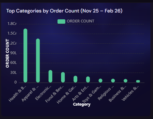 - மொத்த மொபைல் ஆர்டர்களில் கிட்டத்தட்ட 50 சதவீதத்தை சுகாதாரம் & அழகு மற்றும் ஆடை & துணைக்கருவிகள் இணைந்து பங்களிக்கின்றன.